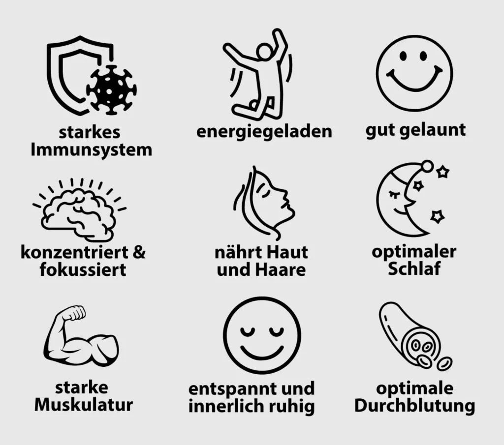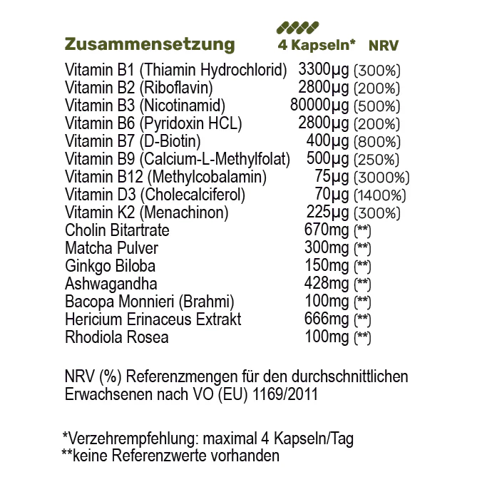 Durch die Einnahme von 2-4 Kapseln täglich kannst du eine nachhaltige Wirkung erwarten. Unsere Kunden berichten von erhöhtem Wohlbefinden, Konzentration, gesteigerter Aufmerksamkeit, innerer Ruhe und einem verbesserten Gedächtnis.
